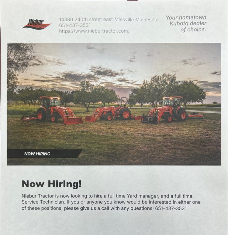 If you're looking for quality equipment and exceptional services provided by trained experts, you've come to the right place. At Niebur Tractor & Equipment, we pride ourselves on matching each customer's unique needs with the Kubota that will serve them best. We're glad you're here, where you can check out our inventory, order parts, schedule a service appointment or simply give us a call at 651-437-3531 and let us know how we can help you.